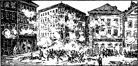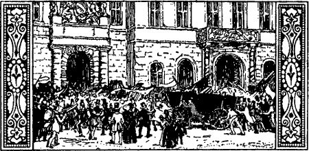 In demselben Augenblick flog die Tür der Wachtstube auf, und die Mannschaft eilte auf den Korridor. Die Soldaten rissen ihre Gewehre aus den Stützen, stampften die kurze Treppe hinunter und stellten sich in einem Gliede schnurgerade auf. Der Kasernendiensthabende stand währenddessen unbeweglich inmitten der Halle und musterte das Heraustreten der Wache mit scharfen Blicken.