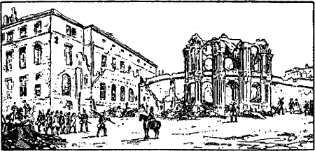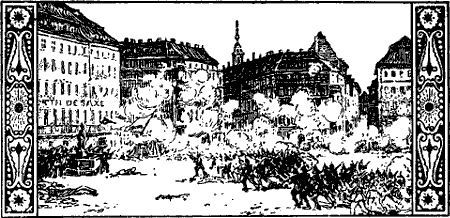 Unter den dichten Baumreihen war es belebt. Friedliche Bürger schlenderten Arm in Arm mit ihren Frauen die Allee hinab, junges Volk trieb allerhand Allotria, und Kinder tummelten sich spielend zwischen den Spaziergängern. Besonders lebhaft war es auf dem unteren Teil der Hauptstraße. Hier stand, gegenüber der Dreikönigskirche,[6] breit und wuchtig die alte Kaserne des 1. Linien-Infanterieregiments Prinz Albert.