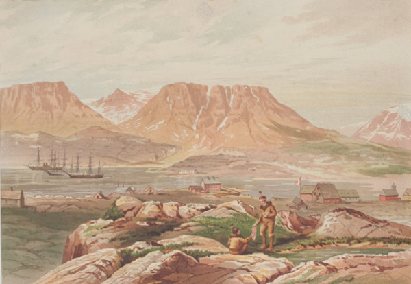 beyond are a fine sample of the southern shores of Disco. A few houses of Danish officials, some storehouses,