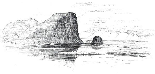 The Expedition left Disco on 15th July, and steamed northward between the island and the mainland. Then, making a short halt at Rittenbenk, it stood down the Waigat. At a distance it seemed as if the whole strait was blocked with icebergs; we, however, found broad leads of water between them, smooth as a mirror, but for an occasional swell, as some great fragment slipped into the sea with a roar like a distant park of artillery. There, with the most earnest wishes for our success, our friends [12] of the “Valorous” bade us adieu. An hour afterwards we found ourselves cruising about amongst the bergs in a thick fog. Every now and then a white mass would be seen gleaming ahead; down would go the helm just in time to avoid collision, and the sound of the sea in the azure hollows along its sides would scarcely be gone when the helm was again hard over to clear another.
