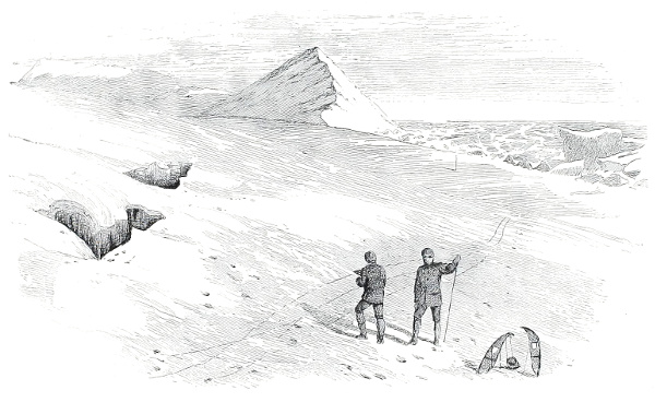 Half-a-mile northward from the depôt, a bank of snow, evidently the accumulation of ages, sloped down from a small hill to the sea. In one place a great slice of the bank had broken bodily from the mass above, leaving a deep crevasse. This was bridged over and completely concealed, except in two places, where the roof had fallen in and exposed its perpendicular walls of green ice streaked with layers of earth and sand. The bank was in fact a miniature “discharging glacier,” the only one yet met with on this coast. A few yards below the openings, the bridge was strong enough to bear the heavily-laden sledges of the western parties. Their course lay through the valley to the left, for though the snow on shore was in many places soft and deep, a short cut across the isthmus promised better travelling than the crush of floes round the cape. The prospects of the northern party were less encouraging. Looking northward from the hill over the crevasse, an icy chaos spread to the horizon. Mirage every now and then raised lines and flakes of distant pack into view, but all as rough and rugged as the ice-floes at our feet.
