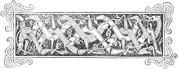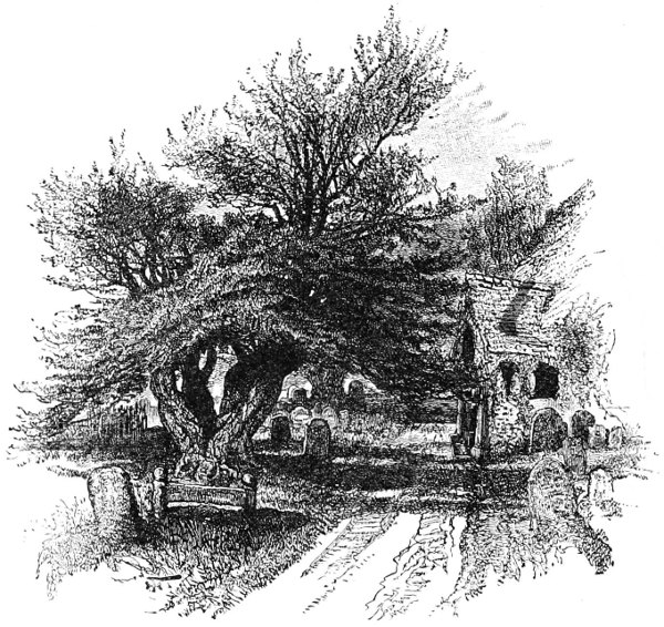 The village of Norham lies a few miles west of Berwick, upon the south bank of the Tweed,—a group of cottages clustered around a single long street. The buildings are low and are mostly roofed with dark slate or red tiles. Some of them are thatched, and grass and flowers grow wild upon the thatch. At one end of the main highway is a market-cross, near to which is a little inn. Beyond that and nearer to the Tweed, which flows close beside the place, is a church of great antiquity, set toward the western end of a long and ample churchyard, in which many graves are marked with tall, thick, perpendicular slabs, many with dark, oblong tombs, tumbling to ruin, and many with short, stunted monuments. The church tower is low, square, and of enormous strength. Upon the south side of the chancel are five windows, beautifully arched,—the dog-toothed[321] casements being uncommonly complete specimens of that ancient architectural device. This church has been restored; the south aisle in 1846, by I. Bononi; the north aisle in 1852, by E. Gray. The western end of the churchyard is thickly masked in great trees, and looking directly east from this point your gaze falls upon all that is left of the stately Castle of Norham, formerly called Ublanford,—built by Flamberg, Bishop of Durham, in 1121, and restored by Hugh Pudsey, another Prince of that See, in 1164. It must once have been a place of tremendous fortitude and of great extent. Now it is wide open to the sky, and nothing[322] of it remains but roofless walls and crumbling arches, on which the grass is growing and the pendent bluebells tremble in the breeze. Looking through the embrasures of the east wall you see the tops of large trees that are rooted in the vast trench below, where once were the dark waters of the moat. All the courtyards are covered now with sod, and quiet sheep nibble and lazy cattle couch where once the royal banners floated and plumed and belted knights stood round their king. It was a day of uncommon beauty,—golden with sunshine and fresh with a perfumed air; and nothing was wanting to the perfection of solitude. Near at hand a thin stream of pale blue smoke curled upward from a cottage chimney. At some distance the sweet voices of playing children mingled with the chirp of small birds and the occasional cawing of the rook. The long grasses that grow upon the ruin moved faintly, but made no sound. A few doves were seen, gliding in and out of crevices in the mouldering turret. And over all, and calmly and coldly speaking the survival of nature when the grandest works of man are dust, sounded the rustle of many branches in the heedless wind.