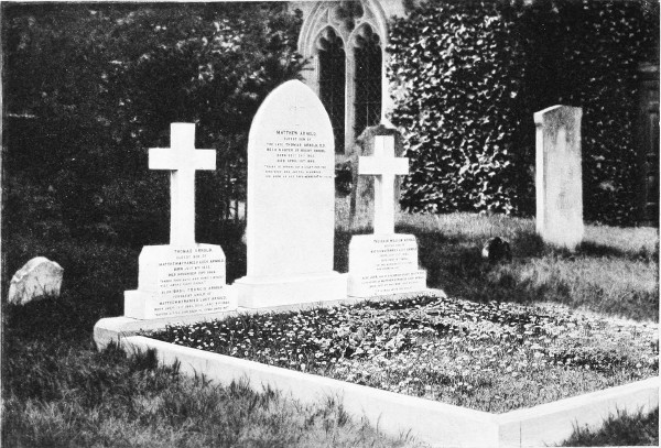 The Letters of Matthew Arnold, published in 1895, contain touching allusions to Laleham Churchyard. At Harrow, February 27, 1869, the poet wrote: "It is a wonderfully clear, bright day, with a cold wind, so I went to a field on the top of the hill, whence I can see the clump of Botleys and the misty line of the Thames, where Tommy lies at the foot of them. I often go for this view on a clear day." At London, August 2, 1869, he wrote: "On Saturday Flu and I went together to Laleham. It was exactly a year since we had driven there with darling Tommy and the other two boys, to see Basil's grave; he enjoyed the drive, and Laleham, and the river, and Matt Buckland's garden, and often talked of them afterwards. And now we went to see his grave, poor darling. The two graves are a perfect garden, and are evidently the sight of the churchyard, where there is nothing else like them; a path has been trodden over the grass to them by people coming and going. It was a soft, mild air, and we sat a long time by the graves."