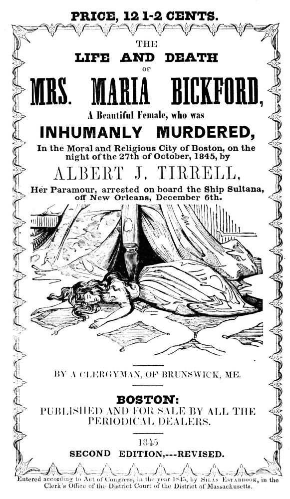 Mrs. Maria Bickford was a native of Oldtown, a small parish near the city of Bangor, in Maine—the daughter of poor but respectable parents. Her maiden name was Dunn. She was born in the year 1822, and was, consequently, twenty-three years old at the period of her awful and untimely end. It is said of her, that, from earliest childhood,[2] she had been the sport of ill omens and startling reverses. At her birth, which occurred before sunrise on a beautiful morning in autumn, a light of strange radiance shone into the apartment, and a sparrow fluttered against the window panes, uttering a plaintive wail, as if seeking admittance.