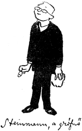A jó tanuló az első padban ül, ahol hárman ülnek: ő a középen, a jó tanuló, Steinmann. Az ő neve nem tisztán egy ember jelzésére szolgál; – szimbólum ez a név, ahány fiú az Osztályban, annyi apa ismeri otthon ezt a nevet. „A Steinmann miért tudja megtanulni?“ kérdezi otthon harminckét apa harminckét fiutól. „Kérd meg a Steinmannt, hogy magyarázza meg“, mondja az apa és a fiu valóban megkéri a Steinmannt. A Steinmann mindent tud előre, még mielőtt megmagyarázták volna. Matematikai lapokba dolgozik és titokzatos szavakat tud, amit csak az egyetemen tanitanak. Vannak dolgok, amiket mi is tudunk, de ahogy Steinmann tudja, az a biztos, az az egyedül helyes, az az Abszolut. -36-