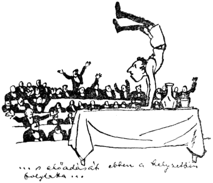 Most pedig, ejnye, jó lesz sietni, ezzel az úrral, aki most szembejön, nyolc óra öt perccel szoktam találkozni. Hát lássuk csak, -22- szedjük össze a gondolatainkat, mert a perc közel van. Szóval: csak szépia kell és lénia. Ezzel szemben Vörösmarty, mint tudjuk, klasszikus tisztaságban tartotta a nyelvet, szavai kristályos tökéletességgel – micsinálnak a szavai? Szentisten, hiszen ezt sem tudom, meg kell gyorsan nézni, micsinálnak Vörösmarty szavai kristályos tökéletességgel. És Nagy Lajos! Szentatyám, gyerünk, ne zavarjunk össze mindent. Vörösmarty kristálytiszta szavakkal elkérte Guttmanntól a gummiguttit. De ha Guttmann nem adja? Akkor, akkor tisztelt tanár úr, fiam ma gyöngélkedett és nem birta elhozni a gummiguttit. Még van egy eset hátra, hogy kigyullad valami, vagy valamelyik tanár meghalt és hazaküldik tíz után az egész osztályt.