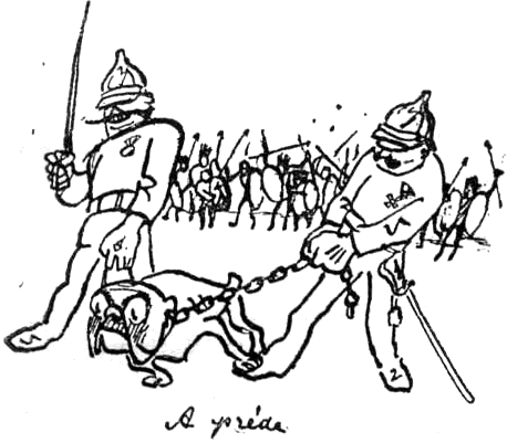 Jó, nem bánom, tanár úr. Tábornoki egyenruhám megfelel? Így. Hát most, utánam, fiúk. Maga, Mákossy tanár úr, maga lesz a hadsegédem… de vigyázzon, hogy mit parancsolok és fogja be a száját… Így. Üljön fel ide hátra a lovamra és kapja el, ha golyó jön… Majd adok én magának. Ne feleseljen, tanár úr. Tanár úr, nem készültél. Hát mondd meg, tanár úr, mi a fővárosa Szerbiának? Na ugy-e, nem tudod. Szerbia fővárosa Budapest, miután én most elfoglalom és hozzácsatolom Magyarországhoz. Ülj le, tanár úr, négyest kapsz.