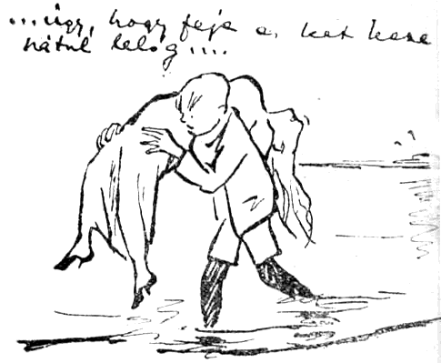 Horovetznéval állunk a Dunaparton, a malom előtt. Az asszony előrehajlik és egyszerre halkan, egy hajlékony és lágy mozdulattal, mintha csak jobban ki akarná nyujtani magát, belefordul a vizbe. Utánavetem magam és derékon kapom el. Egy ideig egymás körül forgat a viz. Aztán -150- földet érek. Kiugrom és magam után vonszolom. Szemei be vannak csukva, a szája félig nyitva, csak felső fogsorát láthatom. A vállamra dobom fel, ugy, hogy feje és két keze hátul lelóg. Két vizes térde nehezen rátapad a derekamra. A langyos viz lábszáramon csorog végig. Borzasztó nehéz: nem birom tovább. Lihegve, szándékosan megbotlom és összeroskadok. Ruhája most -151- arcomba gyürődik, fuldoklom. Rugdalózom, hogy kikeveredjek; mindig szorosabban tapad rám a vizes ruha és hörögve hallgatok el.