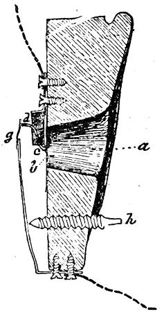 Our knowledge of this form is derived solely from information and sketches supplied by Mr. E. Horkheimer, who assisted Reis in its construction. Figs. 15 and 16 are engraved after Mr. Horkheimer’s sketches. The conical mouthpiece was of wood: the contact pieces of platinum. The point c was attached to a springy slip of brass, g, fixed across the wooden box; and the adjusting-screw, h, served to regulate the degree of initial pressure at the point of contact which controlled the current.