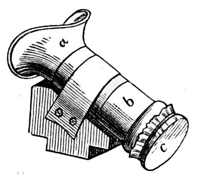 The second form, a tube constructed by Reis himself, of tin, is still to be seen in the Physical cabinet of Garnier’s Institute, at Friedrichsdorf, and is shown in Fig. 7. It consists of an auditory tube a, with an embouchure representing the pinna or flap of the ear. This second apparatus shows also a great similarity with the arrangement of the ear, having the pinna or ear-flap, the auditory passage, and the drum-skin (a, b, c). Upon the bladder c there still remains some sealing-wax, by means of which a little strip[19] of platinum, for the all-essential loose-contact that controlled the current, had formerly been cemented to the apparatus.