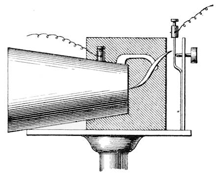 Another transmitter, also a mere variety of the Fourth Form, has been described to me by Herr Peter, of Friedrichsdorf, who assisted Reis in his earlier experiments. Fig. 11 is prepared from a rough sketch furnished me by the kindness of Karl Reis. Herr Peter describes the apparatus as having been turned out of a block of wood by Reis upon his own lathe. The conical hole was identical with that of Fig. 9, but the surrounding portions of the wood were cut away, leaving a conical mouth-piece.