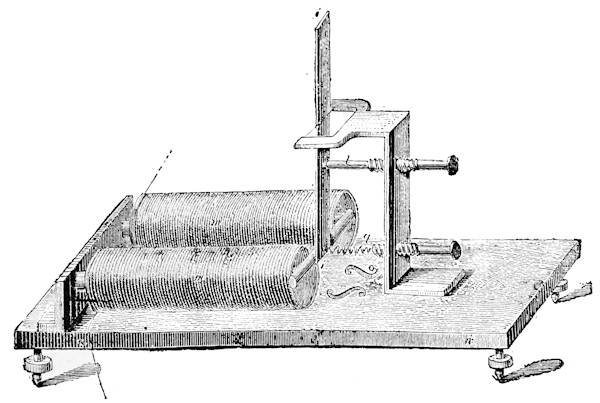 Later a shallow rectangular wooden box was substituted for the violin, and the spiral was laid horizontally upon it (Fig. 20). The date when this modification was made was either at the end of 1861 or the early spring of 1862. A cigar-box was the actual sounding-box, and the needle was supported within the coil, but not touching it, with its ends resting upon two wooden bridges.