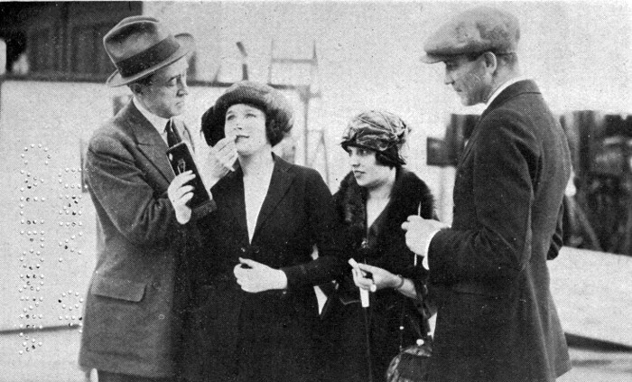 Red photographs black, so particular care must be taken in rouging the lips for movie work. John Emerson is helping May Collins with her make-up, while Anita Loos and the director, Victor Fleming, give suggestions.
