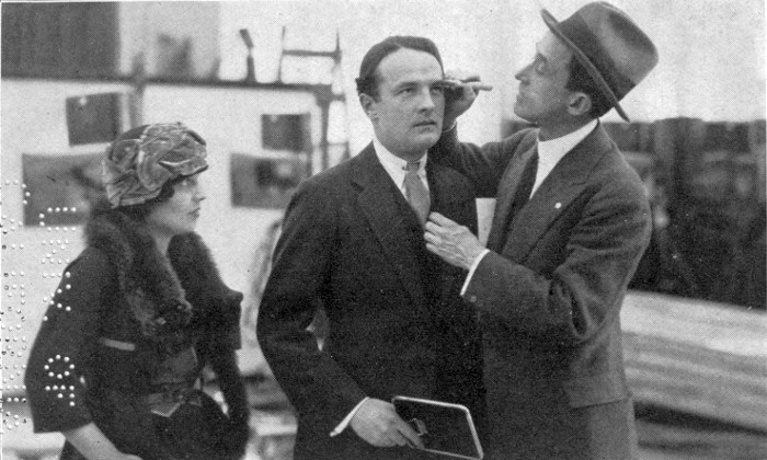The eyes are the most expressive of the features and their make-up is correspondingly important. Here John Emerson and Anita Loos are helping Basil Sydney, the noted English actor, to darken his eyes in accordance with movie technique.