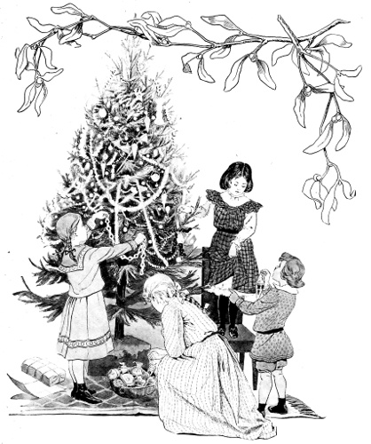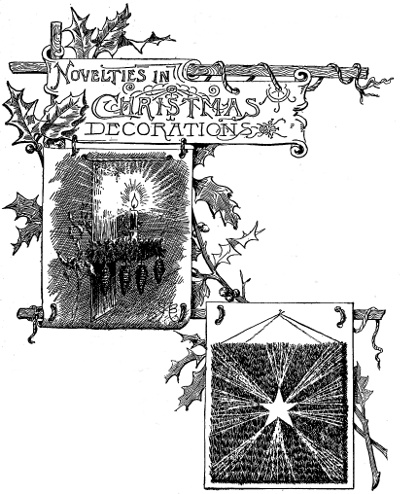 | Effective Portière, 246; Star and Shepherd’s Crook, 246; A Sconce, 248; Tin-foil Christmas-tree Festoon, 248; Tin-foil for Fringe Ruching, 249; Fancy Boxes, 252; Cornucopias, Christmas Stockings, Bobbinet Bags, 253; Holly-leaved Festoons, 254; Pop-corn Balls, 255; Strings of Red Cranberries, Peanuts, 256; Jewelry for the Tree, 257; Gilded English Walnut, 258. | ||