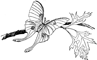 named for the moon and sometimes called the “queen of night.” One evening just at dusk it was my good fortune 378to find a luna moth clinging to a forest tree by the roadside. It had but recently emerged from its chrysalis and was slowly moving its delicate wings back and forth, drying them in the warm night air and strengthening them for flight.