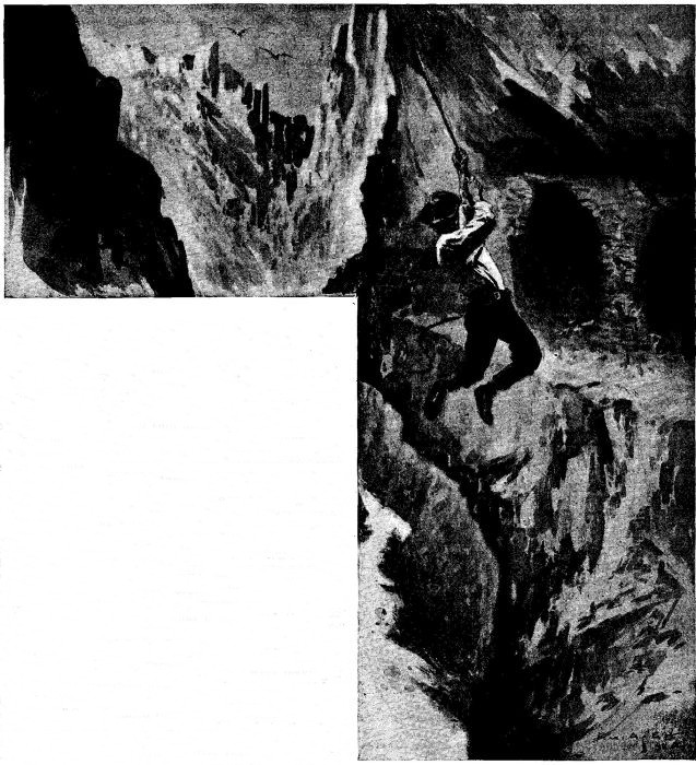 "Strange to say, jest then I felt a current o' cool air a-comin' from the back o' the lidge beyon' the wall. As I went further in the current grew stronger, and the lidge narrowed down so thet I could jest squeeze myself 'long by bendin' somewhat careful like. At last I came to a hole, an' thar the air was so strong jest as if it war comin' up a chimney, only it was as cold as ice. I put the cup into my pocket, an' sounded the hole with my rope. It didn't go straight down, but sloped away, an' I crawled in it, feet first. It was all pitch dark, but I could make my way 'long, slippin' and pushin' with my elbows. All the time the draft kept gettin' stronger, but seemed to me it was growin' warmer, too, and then—"