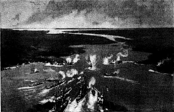 Four miles; three and three-quarters; three and a half—then comes a thunderous uproar as if a mountain-side had fallen! The mortars on two islands send showers of bursting shells that fall upon the group of pretty white torpedo-boats, and blot them from the sea. The thing is done with startling quickness. Before one can count half a hundred the last vestige of the torpedo-destroyers has disappeared beneath the waves. The batteries on Plum Island and Fishers Island have rained destruction in an awful cross-fire.