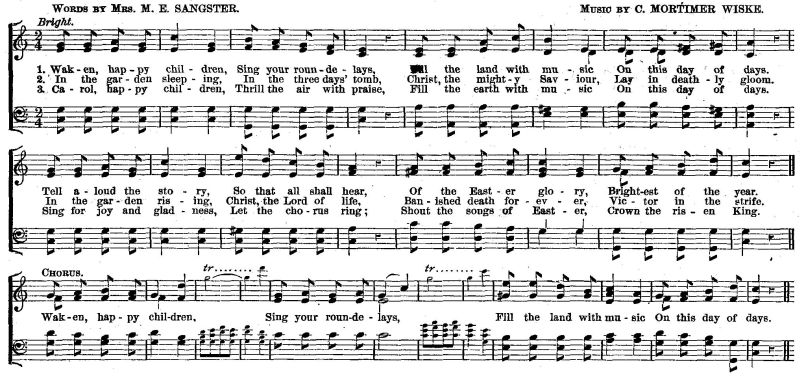 Easter picnics continue during the two following weeks. The fields are at this time of the year all green with half-ripe grain, and bright flowers are seen everywhere. Nature is clothed in her gayest robes of beauty. In order to make these picnics more enjoyable for the children, many families and schools have a fashion of hiding brilliant eggs, colored in red, blue, yellow, pink, purple, and gold, among the mossy rocks and in the green grass amongst the flowers. The children are then sent to hunt for them, and a great deal of merriment is excited as they eagerly rush about, each one trying to find the most.