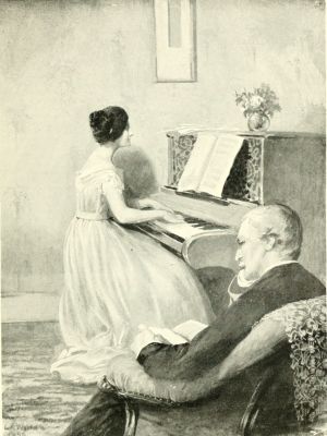 Though a delicate little breakfast-service had not yet been removed from its spider-legged table, the performer at the instrument was already hatted and habited for a ride. Her whole heart, nevertheless, seemed to be in the tips of her fingers while she played, drawing from the keys such[Pg 15] sighs of piteous plaint, such sobs of sweet seductive sorrow, as ravished the soul of the baker below, creating a strong desire to scale the window-sill, and peep into the room. Could he have executed such a feat, this is what he would have seen.