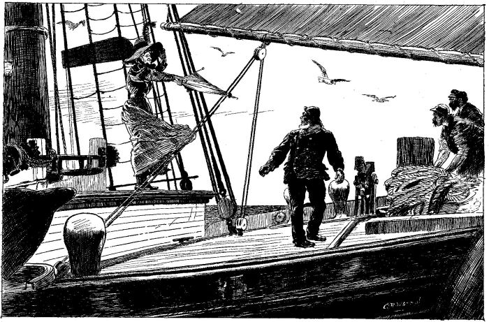 "Waal, the squalls commenced fur to make up jes as soon as ever we started to git the anchor. The old lady, wearin' a wide-brimmed straw hat with a long red feather into 't, an' holdin' a white umbreller over her head, stood aft alongside o' her son. Sez he, 'H'ist the outer jib.' Sez I, 'Lively there, you swabs.' With that the old woman she shet the umbreller down with a snap, jumped forrad in about four hops, an' sez she ter me, sez she,