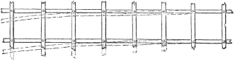 Athwart a keel of large squared timbers, scarphed together and forming with a massive inner keelson the principal member or backbone, were laid the curved frames or ribs which, bolted to each other and to the keel with iron bolts washered and clinched, gave to the hull its transverse strength and form. These frames were held together, as they curved upward from the ground or floor level, by thick longitudinal wales, worked externally along the frames at convenient heights, and curved so as to suit the degree of sheer desired.