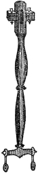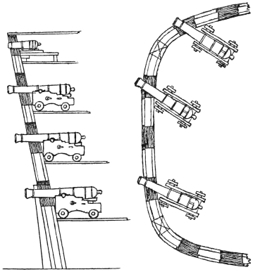 At the fore end the wales and frames converged to the centre-line and the keel was prolonged upward to meet them in a curve or compassing timber, forming the bow or stem: to the beauty and shapeliness of which, with its projecting beak-head, the builder devoted much of his attention and skill. At the other end the frames and wales converged to a square and lofty stern. The stern post was a massive timber fastened to the keel and sloping somewhat aft from the vertical, and from it rose two fashion-pieces “like a pair of great horns,” which formed, with the horizontal arch and transom timbers, the framework of the stern. When the frames had been built up to the requisite height the upper ends of each opposite pair were joined across by horizontal beams, which were secured to them by means of brackets or knees; such beams were worked at the level of the main and other decks, and served to support them when laid. Joined by its beams, each pair of frames thus formed a closed structure: a combination of members which was to resist crushing and deformation, the blows of the sea, the stresses of gunfire, the forces due to the weight of the guns and the vessel itself, and especially the forces thrown on it when the vessel was aground or on a careen. The rigidity of this combination was enhanced by the fitting of pillars which were placed vertically over the keelson to support each beam at its middle. And sometimes the lower pillars were supplemented by sloping11 struts, worked from the curve of the frames up to the middle of each beam above.
