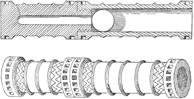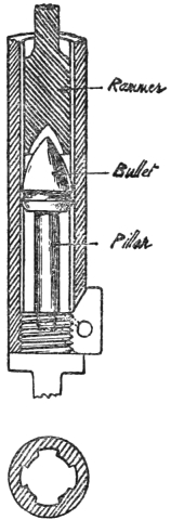 114 In this aspect of the origin of the grooves there is a curious analogy between the rifle-barrel and the drill used in machine tools. In the primitive drill the shank is appreciably less in diameter than the hole cut by the drill, so that the drillings can easily work their way out of the hole. When, however, it was desired to make the shank almost of the same diameter as the hole, so as to form a guide, it was necessary to flute it with two grooves or more to allow the drillings to get away. In the course of its evolution these grooves became spiral.
