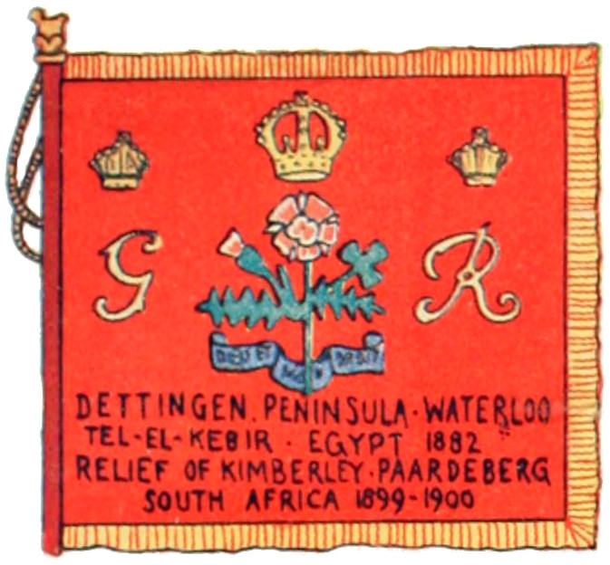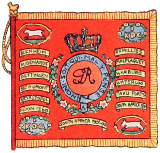 “The King’s or first Standard and Guidon of each Regiment to be Crimson, with the Rose and Thistle, conjoined, and Crown over them, in the Centre: His Majesty’s Motto, ‘Dieu et mon Droit,’ underneath. The White Horse in a Compartment in the first and fourth corners; and the Rank of the Regiment in Gold or Silver Characters on a Ground of the same Colour as the Facing of the Regiment in a Compartment in the second and third Corners.