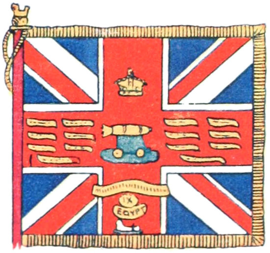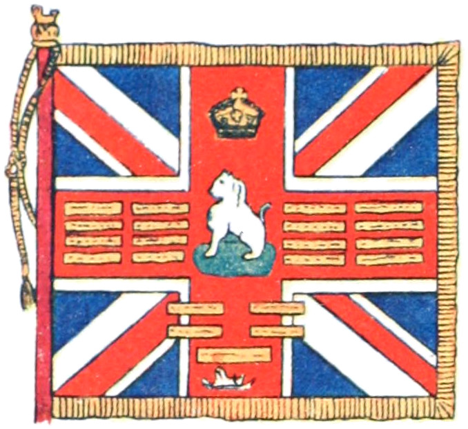 “Her Royal Highness, the Duchess of York and Albany’s Regiment of Foot (4th King’s Own) flies a 11red cross in a yellow field, bordered white, with rays, as that of the Admiral’s, with H.R.Highness’s cypher in the centre.”