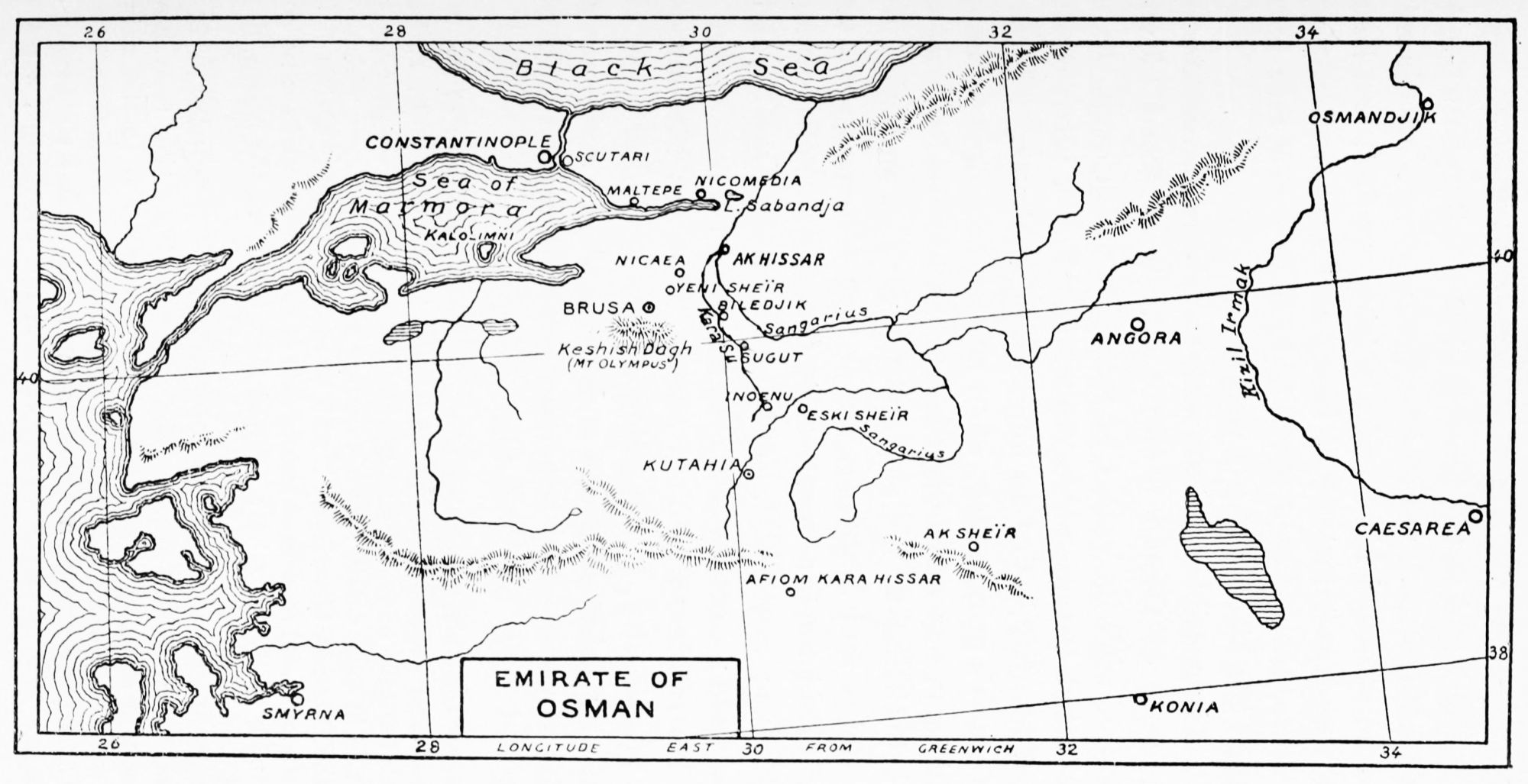 Osman and his people have no history until they come in contact with the Byzantines. The Ottoman chroniclers, and the Byzantine and European historians who have followed them, give at some length the early conquests of Osman. But the accounts are fantastical, obscure, and frequently contradictory. It is the story of a village chieftain, who succeeded in imposing his authority upon his neighbours over an increasingly wider area, until a small state was formed. But it is not the same story as that of the other emirs who built up independent states in the old Seljuk provinces. For Osman founded his principality in territory contiguous to Constantinople, and by attacking{31}