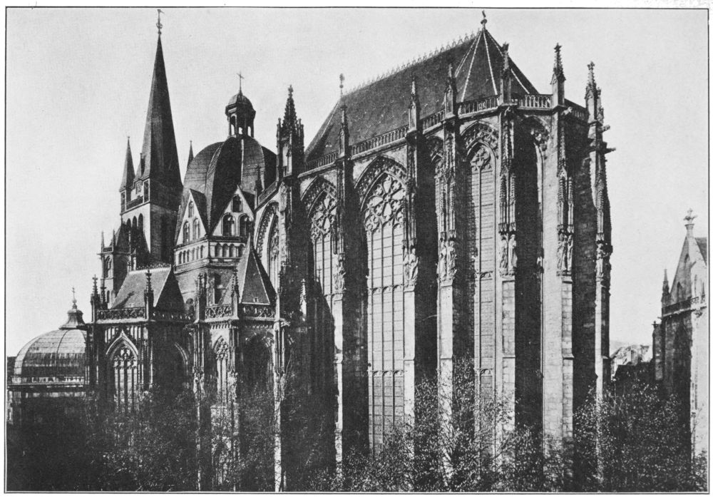 The Church of the Apostles is nearer this later type and has its unfortunate agglomeration of ill-placed towers, but St. Gereon is sui generis; it can hardly be said to have any plan at all, for it is made up of a simple little aisleless church of three bays with a round apse and two small transept-like towers, joined on to an irregular decagon of a nave, somewhat elliptical in plan, with large niches in each of the eight lateral sides and a square porch or narthex at the west end. This anomalous “nave” is early thirteenth century it is true, while the eastern church is one hundred and fifty years older, but the Gothic{281} work is on foundations undoubtedly Roman and takes the place of a structure of somewhat similar plan built by the Empress Helena. The sequence is curious; there was first a circular or elliptical Roman building, on the foundations of which the Empress Helena built her church, the crypt of which still remains, then the easterly choir was built by Archbishop Hanno late in the eleventh century, and finally the original main church was torn down and rebuilt on Gothic lines about 1225.