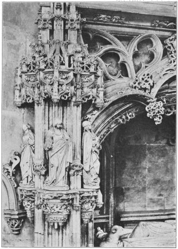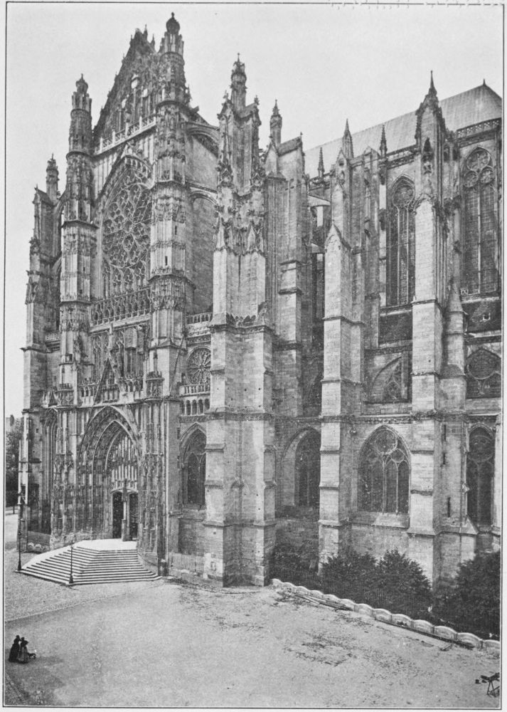 Strasbourg is much more interesting and poetic, with great refinement and originality in design, though its taste is far from impeccable, its structural sense gravely deficient. The tendency is wholly toward lace-like and fantastic design, but it has little resemblance to the late French flamboyant with its curving and interlacing lines; instead, it is more suggestive of the English perpendicular, with its scaffolding of vertical lines applied to, but not a part of, the basic fabric. It has no consistency of plan, for the eastern end, with its semicircular apse and portions of its transepts, is of a singularly noble type of twelfth-century Romanesque, while the nave is mid-thirteenth century and the tower and upper portion of the west front are a hundred years later. Confused as it is, there is an extraordinary charm about it all, for every part is personal and distinguished, full of novel and poetic ideas and all kinds of unaffected touches of genius. The wonderful colour of the exterior and the singularly fine glass of the interior have much to do with its general effect of a delicate mediæval loveliness that makes amends for its architectural shortcomings.