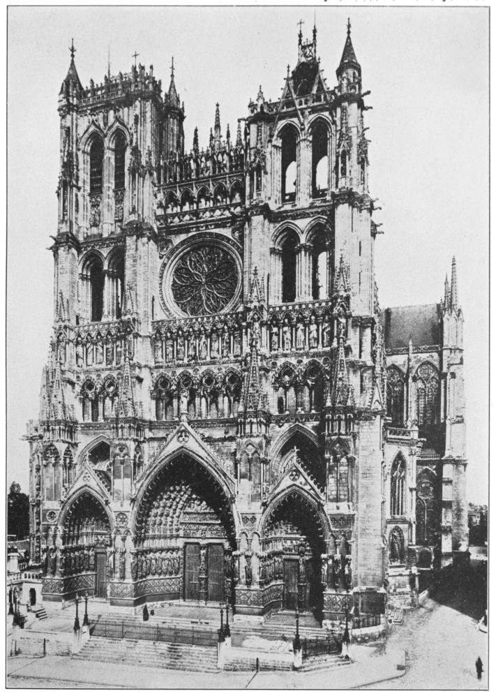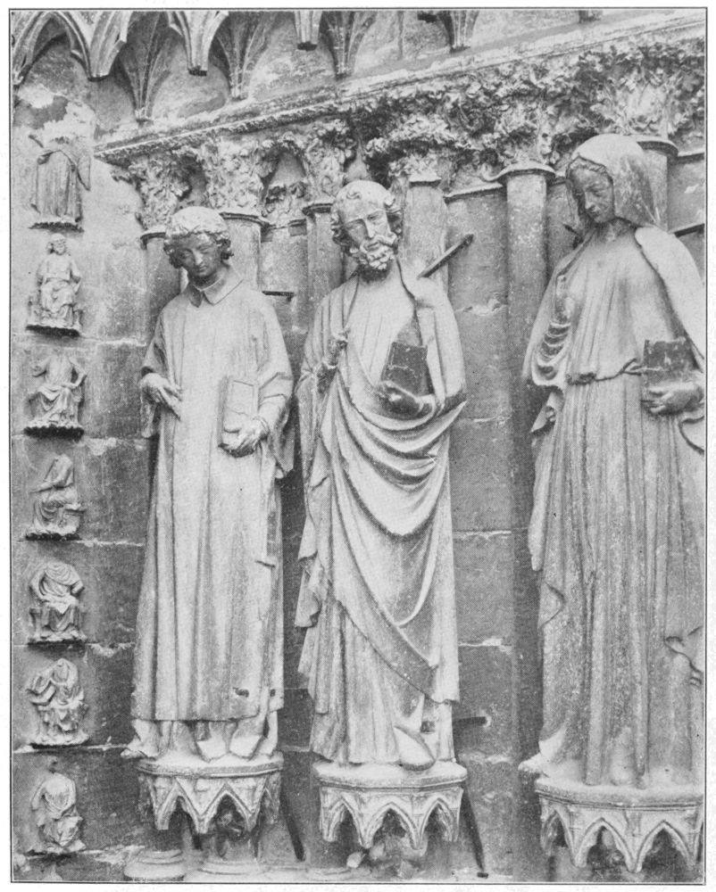 For the making of the west front of Reims all the great masters and craftsmen of France gathered together, and the sculpture showed not only greater excellence than may be found elsewhere, but a greater variety in genius and personality. It is not that in the doors of this façade were to be found great statues in conspicuous places with lesser work all around; every piece of sculpture or of carving was a masterpiece of its kind. High up in the gables, hidden in the shadows of the archivolts, forgotten in odd corners where only persistent search would reveal them, were little figures or isolated heads as carefully thought out and as finely felt as the august hierarchies of the front itself. Personality, varied, vital, distinguished, marked the sculpture of Reims, together with an unerring sense of beauty of formalised line, and an erudition, a familiarity with the Scriptures, with scholastic philosophy, with the