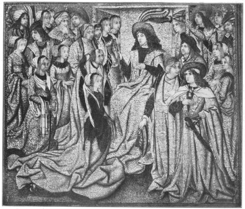 When this sort of thing was the rule in France and England and Germany for more than a century during which civilisation and culture were progressing with such notable rapidity, it is a miracle that anything has come down to us, particularly when you remember what the Calvinists and Sansculottes and Reformers did to monasteries and châteaux and entire cities in the two preceding centuries; but a good deal did so come down, including even the poor remains of the very much domesticated tapestries of Angers. There is only one other fourteenth-century set woven at Arras that can positively be identified, and that is the series now (or recently) in the cathedral of Tournai, though we know from wills and inventories that at the beginning of the fifteenth century they existed in hundreds. The remains of this early work are fine and strong in design, powerful as decoration, clear but faded in{272} colour. With the fifteenth century there came an amazing advance, similar to the sudden appearance of the Van Eycks in painting at exactly the same moment. The “Burgundian Sacraments”—or what remains—now in the Metropolitan Museum as the gift of the late J. P. Morgan, is one of the finest examples in existence of this earliest of the great periods. Admirable as it is, it fails in perfection of beauty before the wonderful works of art that immediately followed. With the beginning of the fifteenth century tapestry weaving came suddenly to a level of supreme excellence that places it for a hundred years on a level with the other arts, however august they may be. Very few of these masterpieces remain in Belgium; you must search for them in Paris, in London, in Madrid, in New York, in the museums of all the world, but the search is rewarded by the discovery of an art that, however brief its day, was one of the great arts of the world.