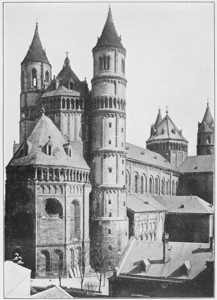In Cologne also are many early, middle, and late Gothic churches; that of the Minorites, St. Severins, St. Panteleon, St. Andreas, St. Cunibert; in fact, Cologne is especially rich in churches of many styles and most of them remarkably good, but they are apt to be overlooked by the tourist who can see, and cares to see, only the overgrown grandeur of the cathedral. Farther up the Rhine we find a long succession of great churches which are characteristically German and well show the best the Teutonic genius was capable of under the highest impulse; Bonn, Coblentz, Mayence, Worms, and Spires are all huge structures and quite in a class by themselves. They are not beautiful by any stretch of courtesy; big they are and massive, with curious combinations of multiplied apses and transepts and towers, but they are without organic quality of any kind, their composition is diffuse and casual, their