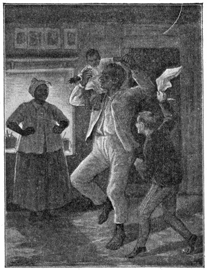 Stor glæde var det paa gaarden den kvelden Georg skulde komme hjem fra sin lange[376] reise. I den hyggelige dagligstuen sad fru Shelby, mens ilden knitred lystig paa arnen. Et vel dækket aftensbord med blankt sølvtøi og fint slebne glas stod og vented paa den kjære gjest. Gamle Tante Chloe havde staat for opdækningen. Iført en ny kjole og skinnende hvidt forklæ, dvæled hun endnu ved bordet for at rette paa et og andet.