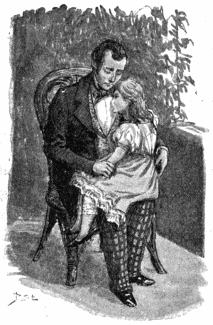 Og den vesle pigen springer bort til ham og borer sig ind mellem knærne hans, paa en slig maade at han nødes til at skyve bøger og papirer fra sig og ta hende op paa fanget. «Den vesle trollunge!» siger han og klemmer hende ind til sig.
