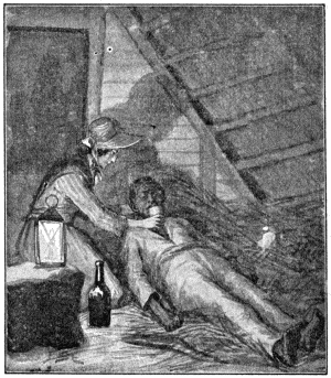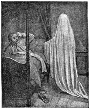 Kvelden efter at Toms lig var blit ført bort, red han til nærmeste by og drak mer end vanlig. Da han langt ud paa natten kom hjem, laaste han døren, la sine pistoler paa et bord ved siden af sengen og kasted sig saa op i den. Træt og udmattet som han var, faldt han snart i dyb søvn. Men det blev en rædsom søvn, med syner og drømme. Han syntes at se sin mors ligklæde. Men det var Kassy som bar det og holdt det op for ham. Saa hørte han suk og skrig; han snudde og vred sig i sengen, blev halvt vaaken, og hørte nu tydelelig at det knirked i døren. Han merked at døren aabnedes, og hørte det rasle sagte, som naar lange klær soper mod gulvet. Han stirred ud i det maaneskins-lyse rum, og fik øie paa[366] en hvid aandeagtig skikkelse, som langsomt nærmed sig sengen. Han kjendte at en kold haand rørte ved ham, og saa hørte han en stemme hviske sagte: «Kom, kom, kom!» Det gik ham til merg og ben. Svetten perled af panden paa ham, han fór ud af sengen og vilde løbe sin vei; men døren var laast; han rev i den, men kunde ikke faa den op, og saa faldt han afmægtig om paa gulvet.