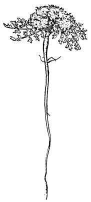 If, however, we consider some of the formations or associations which are the result of extreme conditions of environment, we get more light on the relations between the plants and the factors which control the vegetation. Take the case of the plants inhabiting desert regions such as were discussed in Chapter I. Here the outstanding feature is scarcity of water, and the plants display various remarkable adaptations which fit them for a thirsty life. There are three ways to meet scarcity of water—facilities for gathering it, arrangements for storing it, and economy in using it; and arrangements for all three are familiar features of desert plants. To effect the first, the root-system is extended, and is often enormously developed in proportion to the aerial parts. This adaptation may be studied in the flora of dry places in our own country, such as shingle beaches and sand dunes, which are characteristic semi-deserts. Take such plants as the Sea Holly (Eryngium maritimum), the Sea Convolvulus (C. Soldanella), or the Sea Sedge (Carex arenaria), and compare the extent of the root-system or underground stems with that of the aboveground portions. Fig. 4 represents the Wild Carrot (Daucus Carota) as found growing under extreme exposure on the west coast of Ireland. To meet the conditions the tall branched stem has been entirely dispensed with, and the terminal umbel is seated on the ground in the middle of a ring of leaves. In this way the plant prepares to resist both drought and wind. Water storage is often developed in different parts of xerophytes (drought-resisting plants)—in roots, or stems, or leaves, which become much enlarged, and at the same time covered with a{37}