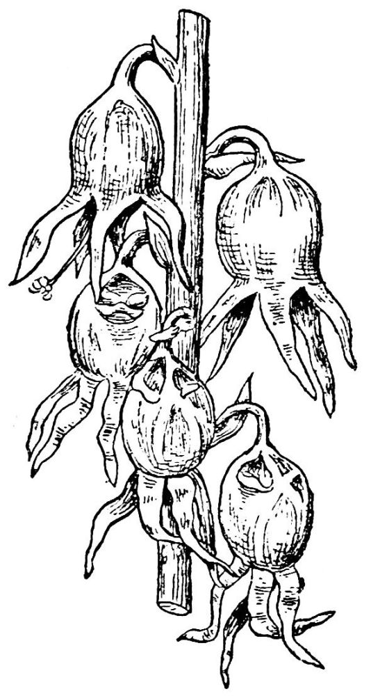 flowers as in many Leeks (Allium spp.). These usually fall from the parent when mature, and being comparatively small and possessed of considerable vitality, they may achieve a considerable dispersal before they send out roots and fasten themselves to the soil. An example is figured (Fig. 7). In this plant (Dentaria bulbifera, the Coral Root, a rather{55} rare native of England) the bulbils resemble not the smooth flower-stems of which they are axillary branches, but the curiously knobby underground stems from which the leaves and flowering shoots arise.