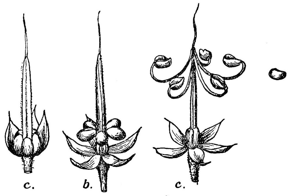 a, Plant, 2/3; b, male flower; c, female flower, both enlarged.