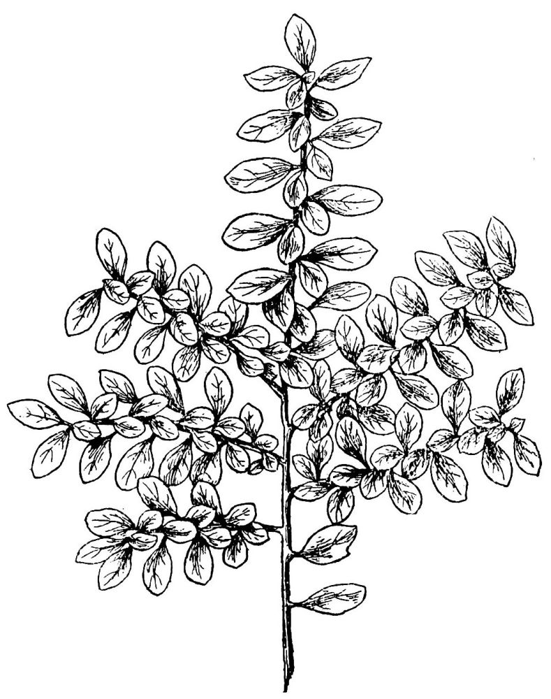 plant growth is characteristic of semi-desert regions, where the points of similarity of environment to those of the mountain-tops are evident. This cushion form has many advantages for the alpine plant. It keeps it warm in winter and cool and damp in summer; it allows it to produce a great amount of blossom without the necessity for extensive growth; it resists the utmost efforts of furious gusts of wind almost as well as would a half-buried stone; on the most storm-swept cliffs its fresh green blobs “welcome every changing hour, and weather every sky.” Fig. 32 shows a boss of this kind, composed of the Cushion Pink (Silene acaulis), with an admixture of Filmy Fern (Hymenophyllum unilaterale) and a Moss (Mnium hornum). The shrubs of the alpine zone are mostly small and creeping, weaving themselves among the vegetation, and with low grasses and sedges forming a mat which is equally resistant to all inimical conditions. Their leaves are small, to avoid damage by wind or by excessive transpiration. In some genera—for instance, Veronica—the diminution of leaf surface accompanying more elevated habitat is very striking. In the New Zealand lowlands broad-leaved forms (Fig. 34, left) are met with, which give way, as one ascends to 8,000 feet, to such forms as V. Hectori (Fig. 34, right), in which the leaves are reduced to mere scales, and the plant much resembles some of the Cypresses or other Conifers with marked xerophile characters.