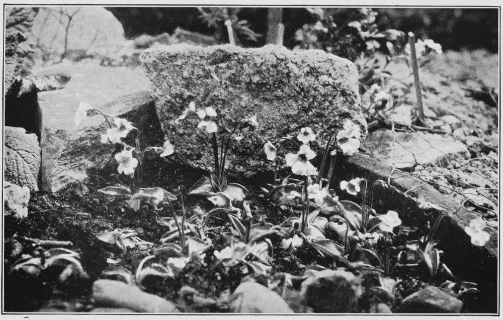In comparison with the Sundews, the other insectivorous plants which are included in the British flora are of less interest. The Butterworts (Pinguicula), of which four species are known in these islands, have a rosette of smooth, broad, yellowish leaves covered with glands which exercise the same functions as those of Drosera. To the touch of raindrops, sand-grains, or other inorganic substances they are indifferent; but a tiny insect alighting on the sticky leaf at once provokes an outpouring of secretion, while the leaf rolls inward from the edges till the victim is securely caught; it is then digested as in the Sundew.