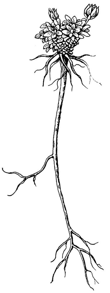 Again, the mountain climate, with its heavy rainfall and long cold period, tends to the formation of peat; and the acids thus engendered in the soil, as well as the low temperature prevailing during most of the year, render difficult the absorption of water by the roots of plants. The conditions under which alpine plants, then, live may be summed up as follows: a long cold winter, a short summer; great exposure; scarcity of food-supply. The modifications which plants have undergone to meet these conditions are very marked, and render alpine plants a source of constant interest to the traveller and of delight to the gardener. The effect of low temperature (also of peaty soil) in rendering difficult the absorption of food materials, and causing extensive root production and limited stem and leaf growth, is immediately observable. In Fig. 33 is seen an alpine Stonecrop (Sedum primaloides) as growing on the Chinese Alps at some 12,000 feet. The root is out of all proportion to the aerial parts. The same plant in the garden forms a little bush with branching stems half a foot long, and flowers borne on leafy axillary shoots a couple of inches long, while the roots are short and tufted. The most characteristic form which alpine plants assume may be called the cushion type. This is produced by excessive branching of the stems of small-leaved plants, accompanied by but little longitudinal growth; and it is excellently shown in many well-known plants such as the Mossy Saxifrages, the Kabschia Saxifrages, the Cushion Pink (Silene acaulis), and a number of others. The same type of{192}