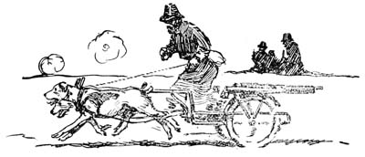 Some of the peasants used dogs to harrow and cultivate their vegetable gardens, but Père Jean owned a big black horse named Medard, so that Luppe’s only duty was to draw the milk-cart and to bark at night if strangers approached. When Pierrot grew old enough Luppe taught him to wake up and bark at strange noises and to keep quiet at other times, for a good watchdog does not waste his breath on the moon. When the huntsmen rode by with their chiens de chasse Pierrot would become very much excited[Pg 15] and wanted to follow them, but Luppe explained to him that their vocation was a very foolish and frivolous one, and beneath the dignity of a chien de trait, though Luppe himself would often lose his head over the warm scent of a hare, or even of a rat or mole.