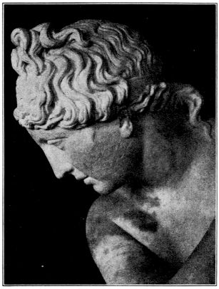 Our Blessed Lady of Milo, as we may call this beautiful representative of Greek paganism in imitation of Veit Valentin’s name Die hohe Frau von Milo, has always a group of admiring visitors sitting quietly before her, and there is often a hush in the room which recalls the sanctity of religious{26} chapels attended by quiet worshipers. There is a sacred atmosphere surrounding the statue and even the hurried globe-trotter feels that he has come into the presence of some divinity that exerts her influence upon the world not by might, but by beauty, grace and loveliness.{27}