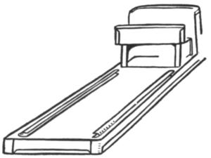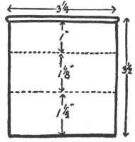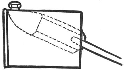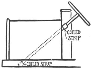 The hinged top is left on the box that is to hold the unburned matches. This box is soldered to two supporting brackets in such a manner that it is held away from the piece of tin forming the back for the two boxes and so that the lid of the upper box may be raised. The lower box is simply soldered to the back piece. Three folded strips of tin are soldered to the front of this second box to form a holder for a strip of sand paper to strike the matches on.