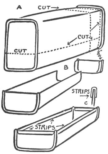 The Match Box.—The match box is made of two cigarette boxes, one for good matches and the other for burned matches. These boxes are of ample size to hold the paper drawer of a large box of parlor matches.