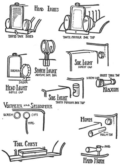 Look at the end of a small olive oil can or the end of a tin commonly used to contain cocoa, then think of the shape of the radiator and hood of the modern automobile. The shape of the can and the shape of the hood of the automobile are very much alike. A few holes punched in the end of the can in regular rows transform it into a miniature radiator in appearance, and some slits cut in the side of the can look very much like the vents in the side of a real auto hood. Solder the cap of a tooth-paste or paint tube in place over the radiator, and the hood and radiator are completed.